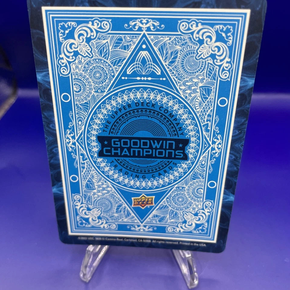The product is a 2022 Upper Deck Goodwin Champions basketball trading card featuring rookie athlete Dyson Daniels. This specific card is from the Playing Cards insert set and has a diamond pattern design. With a near mint or better condition, collectors can add this unique card (#9-DIAMOND) to their sports trading card collection from Upper Deck.