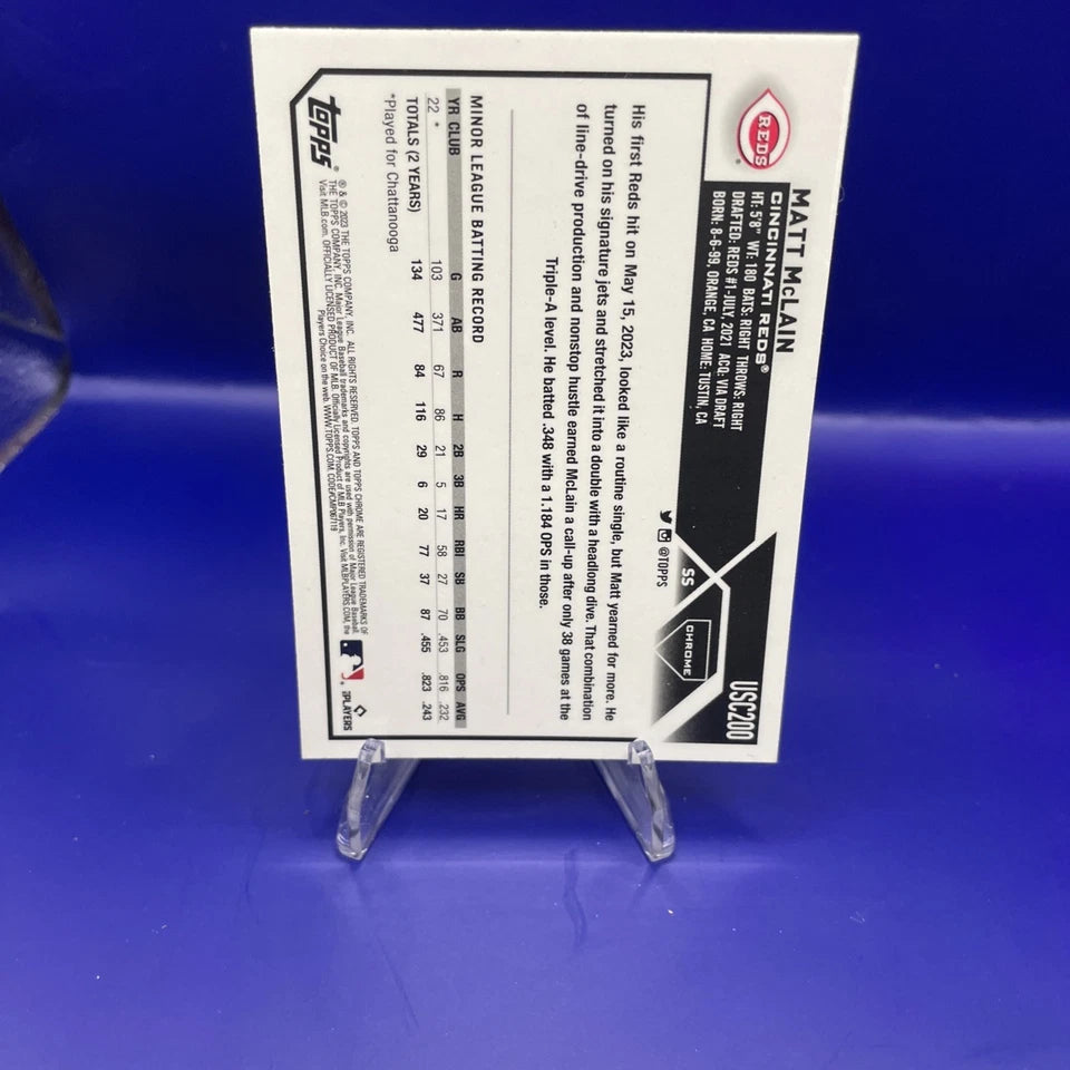 The product is a 2023 Topps Chrome Update Series baseball trading card featuring Matt McLain, a rookie player for the Cincinnati Reds in Major League Baseball. This particular card is a Pink Refractor parallel variety, making it a rare and sought-after collectible item for fans and collectors. Manufactured by Topps, the card is part of the base set for the 2023 season, adding to its value and appeal among baseball enthusiasts.