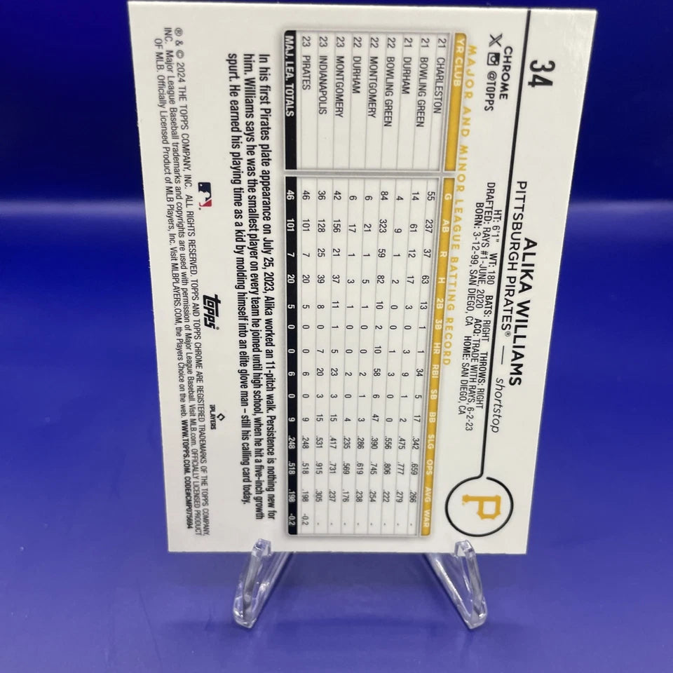 The 2024 Topps Chrome Alika Williams #34 Pink Refractor (RC) trading card is a highly sought-after collectible item for baseball fans. This rookie card features the up-and-coming player from the Pittsburgh Pirates, making it a valuable addition to any baseball card collection. Produced by Topps, a well-known manufacturer in the sports trading card industry, this parallel variety card is sure to stand out with its pink refractor design. Whether you are a seasoned collector or just starting out, this card is a must-have for any MLB enthusiast.