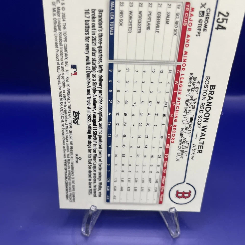 The product is a 2024 Topps Chrome baseball trading card featuring Brandon Walter of the Boston Red Sox. This particular card is a Pink Refractor parallel variety, making it stand out among the rest in the set. As a Rookie Card, it holds value for collectors looking to add a piece of the player's early career to their collection. The card is in near mint or better condition, making it a desirable addition to any MLB trading card collection.