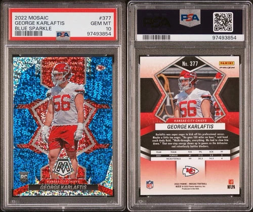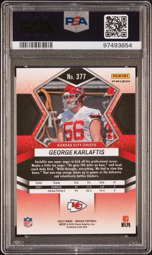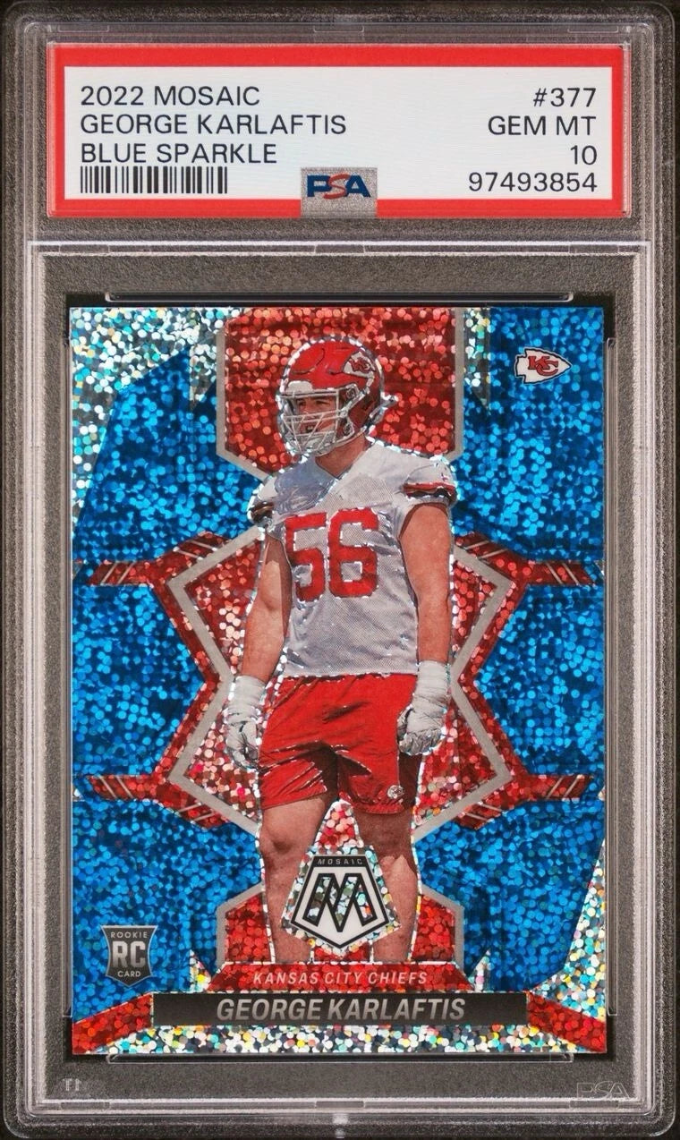 This is a rare George Karlaftis Blue Sparkle Mosaic trading card from the 2022 Panini Mosaic set. The card features the Kansas City Chiefs rookie player in a National Football League (NFL) edition. It has been professionally graded by the Professional Sports Authenticator (PSA) with a grade of 10, making it a valuable addition to any sports trading card collection. The card number is 377 and it is a parallel/variety card, which adds an extra touch of uniqueness to this item. Get your hands on this stunning sports trading card today! This Card has a POP of 1 This is truly 1/1