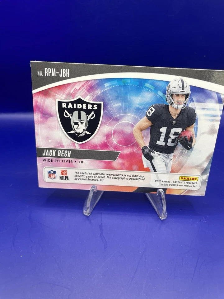 The product is a 2025 Panini Rookie Premiere Football trading card featuring an autograph and patch from rookie player Jack Bech. This card is a limited edition with a card number of 299, making it a sought-after collectible among sports card enthusiasts. With the combination of being part of a premier set by a reputable manufacturer, the card captures a significant moment in the player's career, making it a valuable addition to any football card collection.