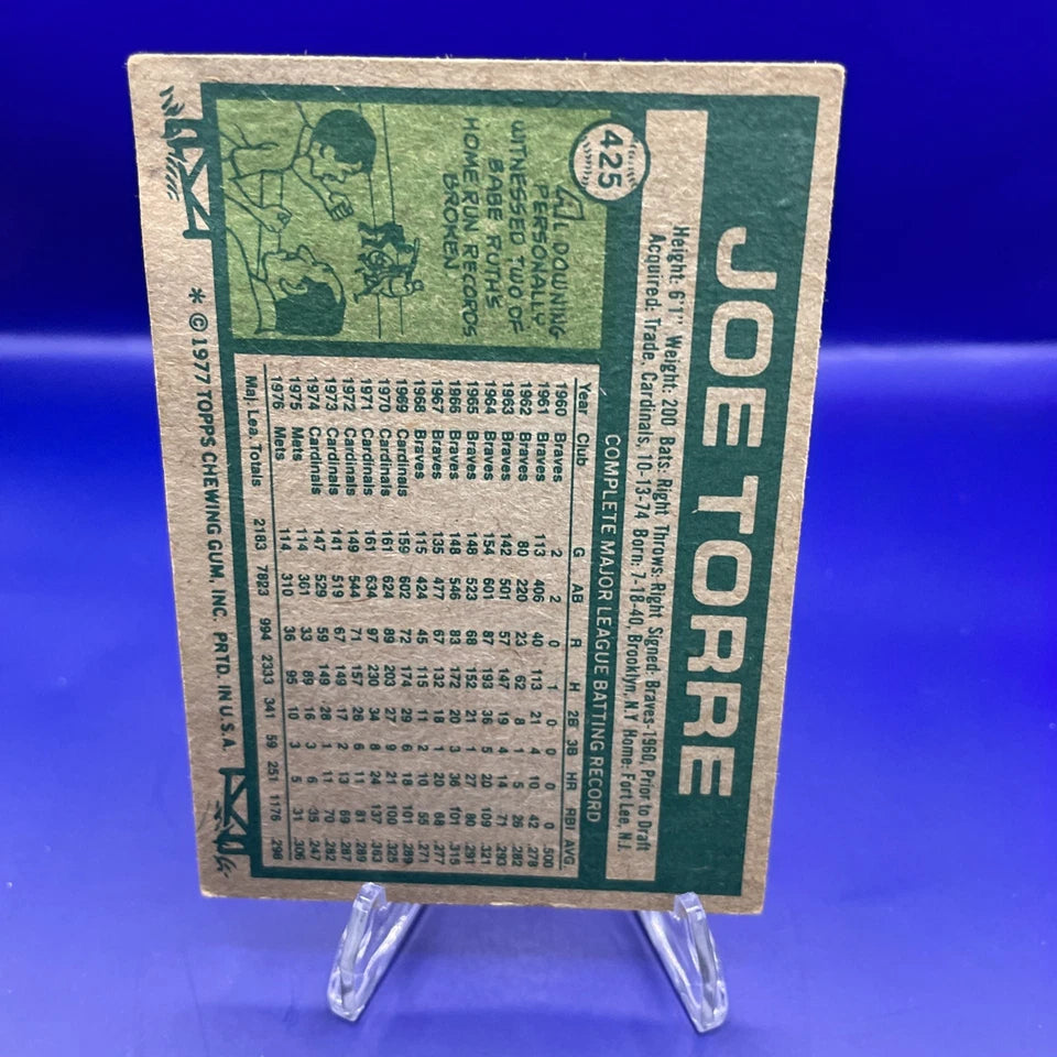 The product is a 1977 Topps baseball trading card featuring Hall of Famer Joe Torre from the New York Mets. This collectible item represents a piece of Major League Baseball history, specifically from the 1977 season. As a manufactured product by Topps, it holds sentimental value for fans and collectors of baseball memorabilia. The card is ungraded and in very good condition, making it a desirable addition to any sports trading card collection.