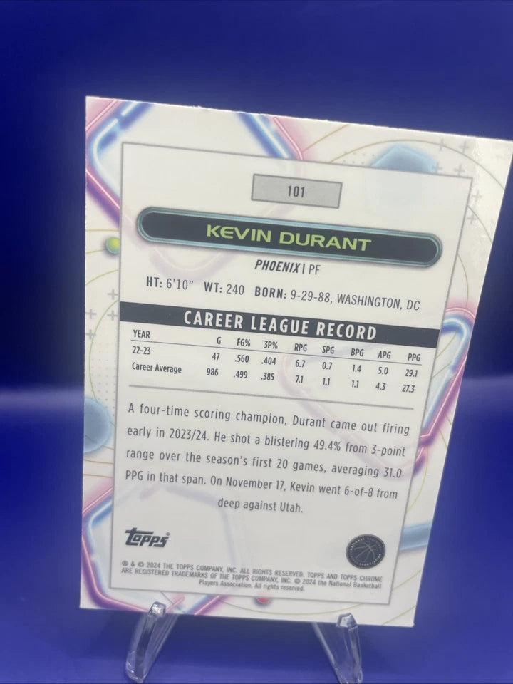 The product is a 2024 Topps Chrome trading card featuring basketball player Kevin Durant. Manufactured by Topps, this card is a part of the 2024 Topps Chrome set and is numbered as card #101. Perfect for collectors and fans of basketball memorabilia, this card offers a unique and valuable addition to any sports trading card collection. Pick Up Legend at Budget Price
