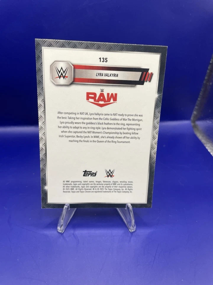 The product is a topps chrome refractor trading card featuring wrestling athlete Lyra Valkyria from the WWE. This card, numbered 135, is part of the 2025 season collection by Topps. The chrome finish gives it a shiny and reflective look, making it a desirable variation for collectors and fans of the sport.