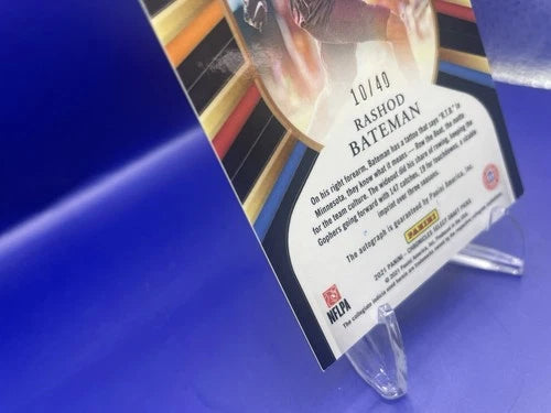 The Rashod Bateman Panini Select In Flight Rookie Auto trading card is a valuable collectible for football fans and card enthusiasts. Featuring the talented player from the Baltimore Ravens, this limited edition card is a must-have for collectors looking to add a rare piece to their collection. With only 40 copies produced, this card showcases Bateman in his rookie year, making it a highly sought-after item for fans of the sport and the player.