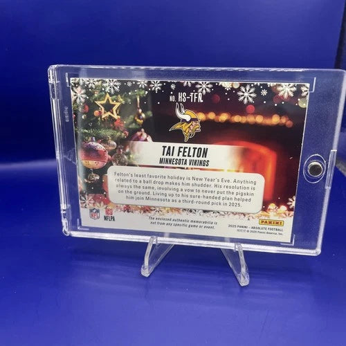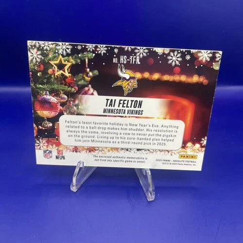 The Tai Felton Rookie Patch is a football trading card featuring a patch design, specifically highlighting the rookie status of the player. As a unique aspect in the world of sports trading cards, patches are sought after by collectors for their aesthetic appeal and potential rarity. This card would appeal to fans of football looking to add a special rookie patch card to their collection, adding a piece of memorabilia from a promising new player to their sports trading card assortment.
