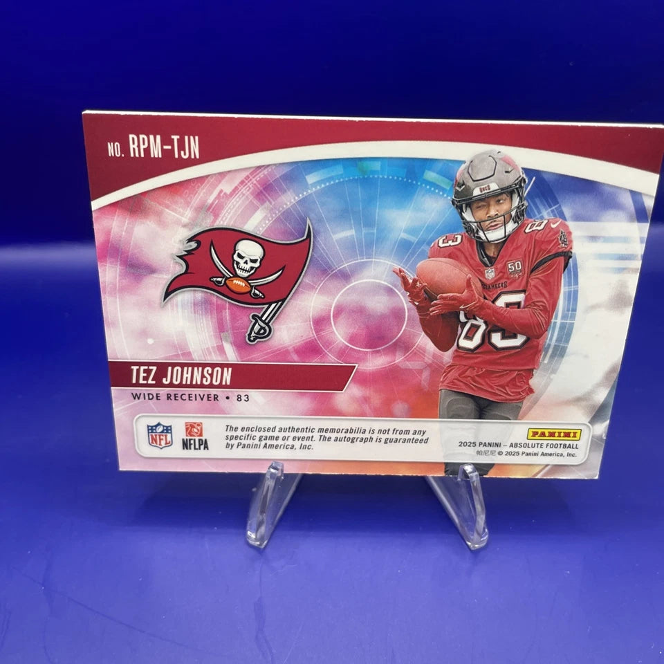 The Tez Johnson 2025 Panini Absolute Rookie Patch Auto trading card is a highly sought-after collectible in the sports trading card market. This limited edition card features an autograph from the football rookie player, making it a valuable piece for any fan or collector. With only 299 cards produced, it is a rare find and a must-have for those looking to add a unique and special piece to their collection. Produced by Panini, known for their quality and attention to detail, this card is a standout addition to any sports trading card collection.