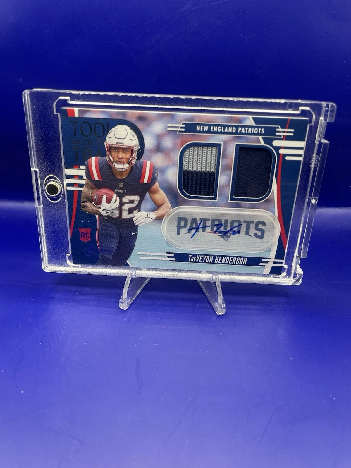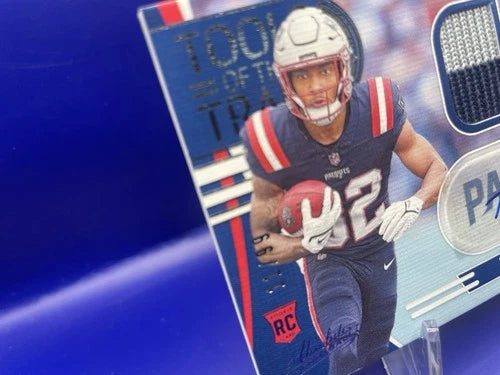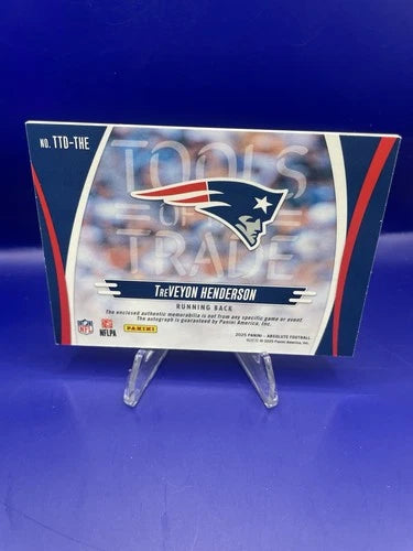 The product is a 2025 Absolute Rookie Patch Auto trading card featuring Treveyon Henderson, a football player. This card is autographed by Henderson and is a limited edition with only 99 copies produced. Manufactured by Panini, this sports trading card is a valuable collectible for fans and collectors alike.