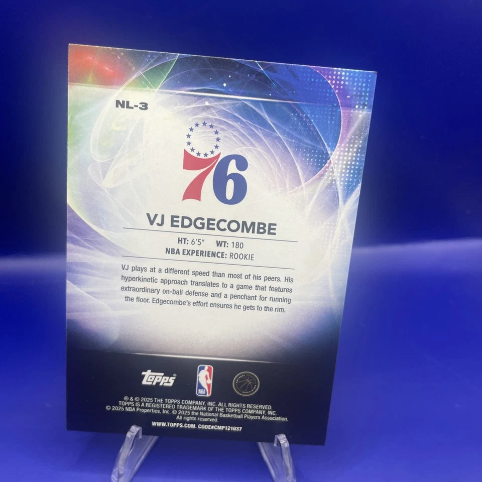The VJ Edgecomb Topps Rookie Card is a limited edition basketball trading card manufactured by Topps. This card features a rookie player and is a part of the No Limit Parallel series, making it a highly sought-after collectible for basketball fans and trading card enthusiasts. It is a valuable addition to any sports memorabilia collection, especially for fans of the player featured on the card.Record Breaking Sixer Guard